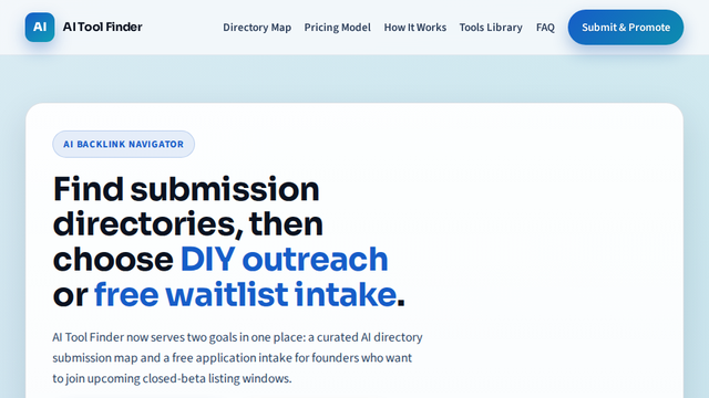 AI Launch Navigator aims to revolutionize the way AI tools are launched by serving as a comprehensive submission directory and outreach hub. The project combines a curated directory of AI submission channels with a streamlined application process, allowing founders to not only find the right platforms but also to efficiently submit their tools for publication. As a hub for AI tools, AI Launch Navigator positions itself uniquely within the ecosystem by offering a free directory with clear lane types (free, mixed, editorial) that significantly reduces the time and effort required for manual outreach and submissions. The dual function of being both a directory and a waitlist application system means that startups can seamlessly integrate their launch processes with effective outreach strategies. With the increasing number of AI startups, the demand for efficient marketing and outreach solutions has never been higher. By enabling immediate access to a categorized list of submission channels and an application process for beta listings, AI Launch Navigator supports founders in achieving better launch visibility and success. Given the continuous growth in AI technologies, this project taps into a burgeoning market, providing essential solutions that address common pain points faced by new entrants in this space, such as time constraints, limited outreach capabilities, and the need for strategic marketing.