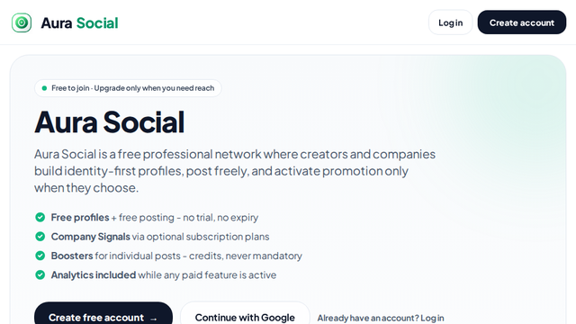 Aura Social is an innovative professional network designed specifically for creators and companies who wish to establish a strong online presence and achieve their goals through effective networking. Unlike conventional platforms, Aura Social emphasizes the creation of identity-first profiles that allow users to maintain a clear delineation between personal identity and corporate governance. This unique structure fosters collaboration within teams while enabling creators to enjoy independent visibility. The platform offers intuitive tools for promoting content through activated Signals for companies and optional Boosters for creators, promoting transparency in advertising economics. Users benefit from connected analytics, which provide insights into performance without the need for additional tools. The comprehensive approach offered by Aura Social promotes practical growth and maintains a unified professional presence that is accessible to everyone globally. With defined subscription plans, Aura Social shifts away from traditional pay-per-click models, making advertising costs predictable and manageable for users. Additionally, the platform is built with security in mind, ensuring the trustworthiness of user data. The project aims to bridge the gap between creators and companies, ensuring a seamless interaction driven by authentic relationships.