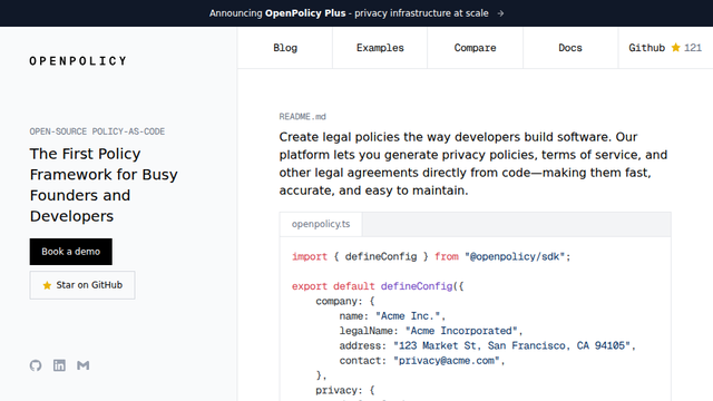 The primary problem OpenPolicy Plus addresses is the outdated, complex, and often costly process of creating legal documents for tech companies. Many startups and developers struggle to keep their legal agreements up-to-date, leading to potential non-compliance with increasing privacy regulations. By transforming the creation of privacy policies and terms of service into a seamless coding experience, OpenPolicy eliminates the barriers traditionally faced, such as high costs associated with lawyers, prolonged timelines, and manual updates. Moreover, it resolves issues with maintaining compliance across different jurisdictions and legal frameworks. OpenPolicy provides an automated, scalable solution that brings efficiency and clarity to an essential aspect of software development in the current regulatory landscape.